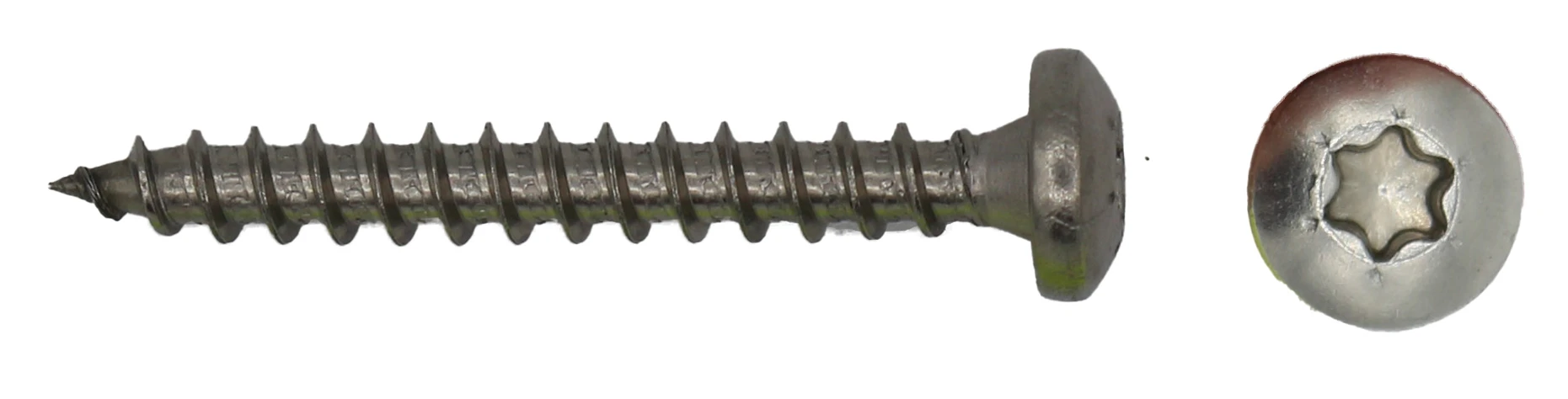 Material rostfritt stål (A2). Universalskruv med rundad huv och torx-spår, finns med både delgänga och helgänga (gängan anges i produktnamnet, t.ex. helgänga 6x60/60 och delgänga 6x60/36). Allroundanvändning för trä- och skivförband. Torx-huvudet ger bra grepp för verktyget.