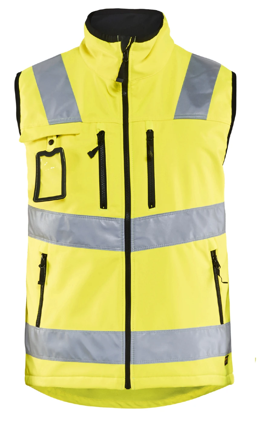 Två bröstfickor och två sidofickor med dragkedja. Två stora nätfickor på insidan. Ficka för ID-kort. Justerbar nederkant. Förlängd ryggdel. Fleecefodrad krage. Vattenavvisande och vindtät. Fluorescerande färger. 50 mm reflexband. Material: 100 % polyester, softshell-typ i 3-lagers tyg som är vindtätt, vattentätt och har god andningsförmåga. Vikt: 300 g/m². Godkännanden: EN ISO 20471, storlekar XS-S klass 1, storlekar M-3XL klass 2 - varselkläder med hög synlighet.