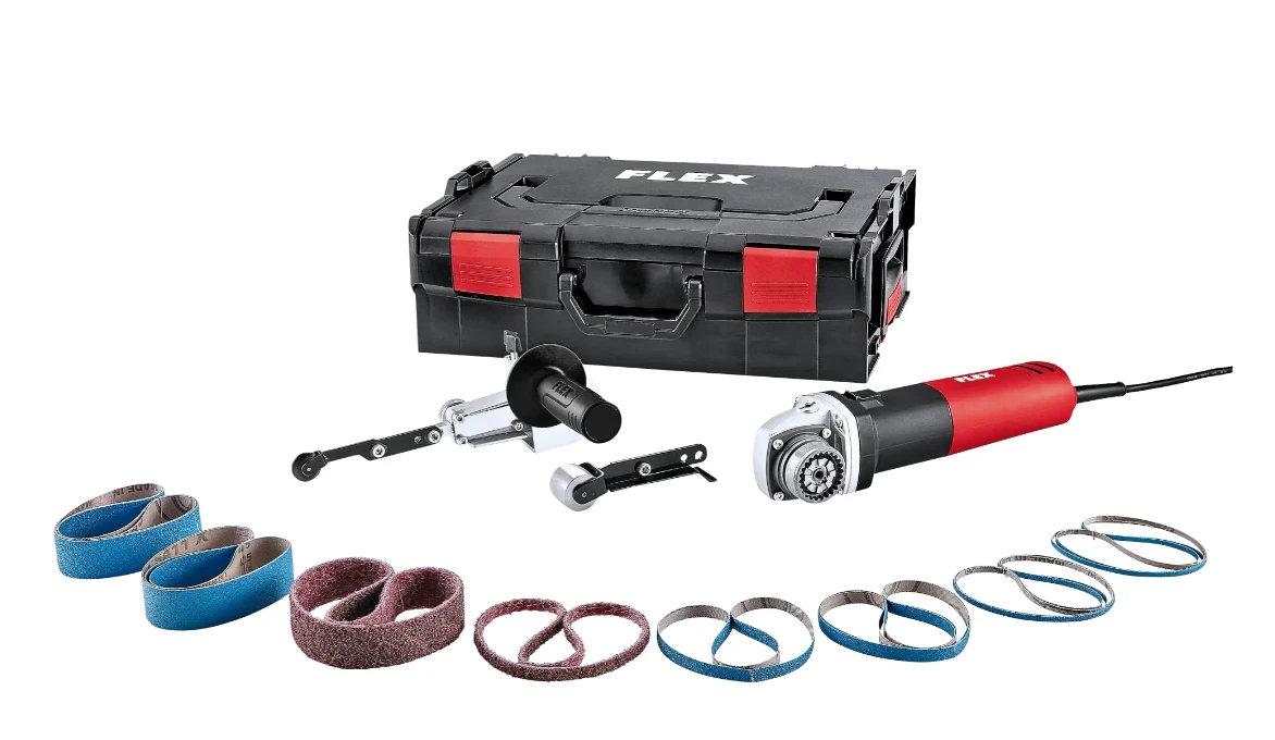 FLEX FBE 8-4 140 TRINOXFLEX Set är en bandputs-maskin med steglös varvtalsreglering, överbelastnings- och temperaturskydd samt en unik snabbinställning. Maskinen har ett inkapslat elektronik-kort, tre lindningsskydd och en sliparm som kan vridas 140°, utrustad med två sliphuvuden.