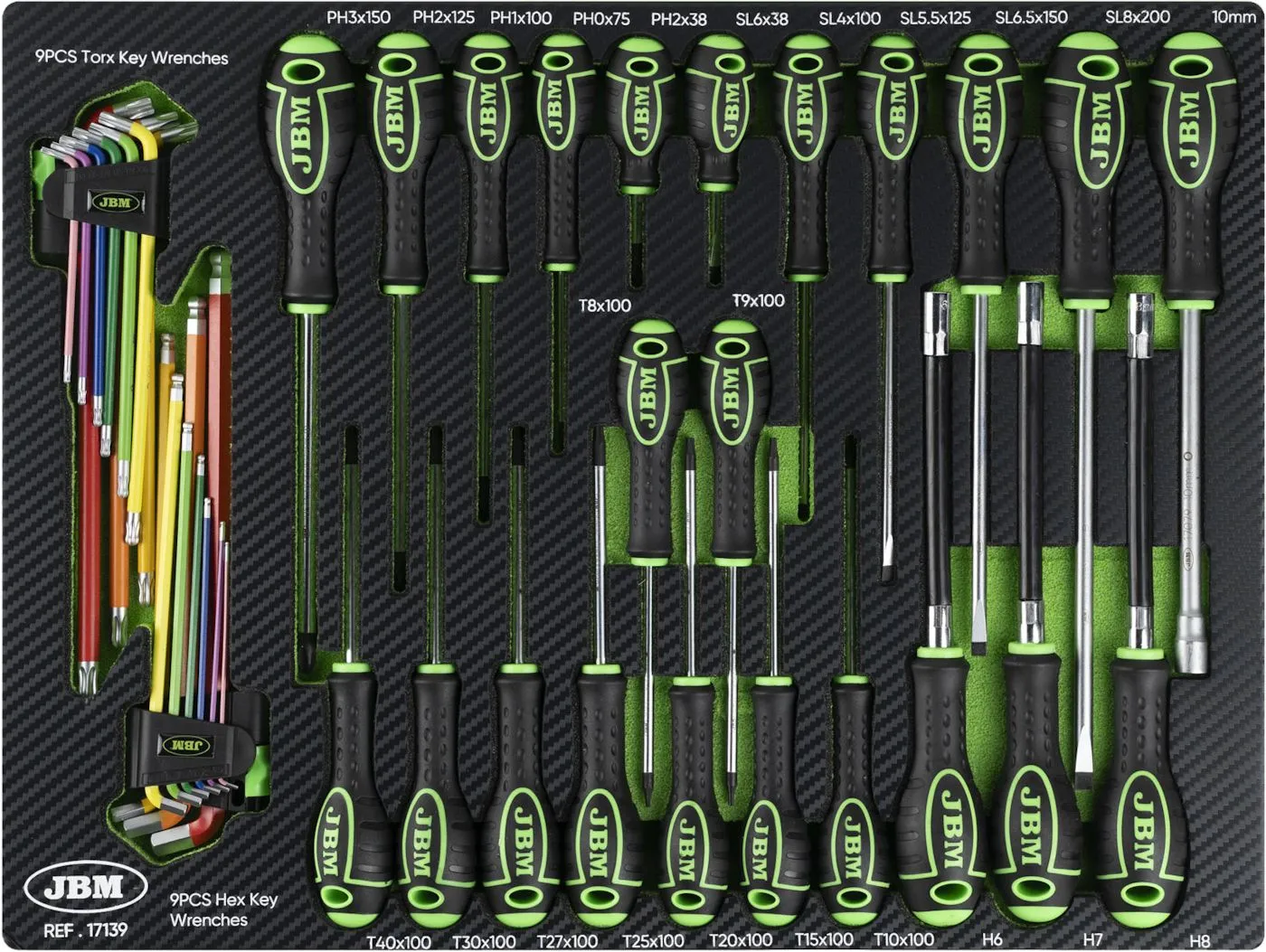Skruvmejselsats i skuminsats 525x395x40mm. Satsen innehåller: PH, SPÅR, TORX-skruvmejslar, insex- och Torx-nycklar (108° böjda), flexibla hylsnycklar 6, 7, 8mm, samt hylsnyckel 10mm.