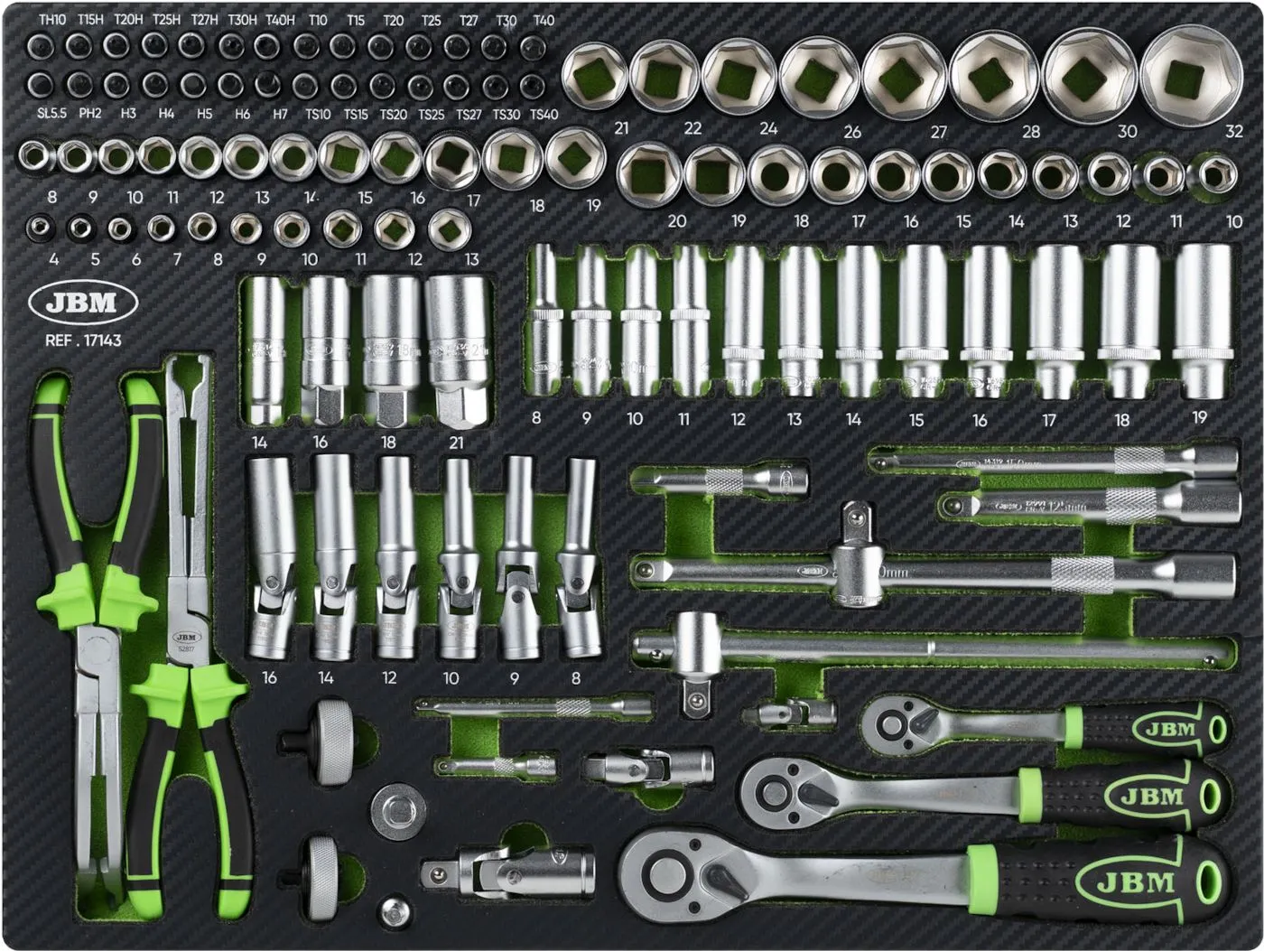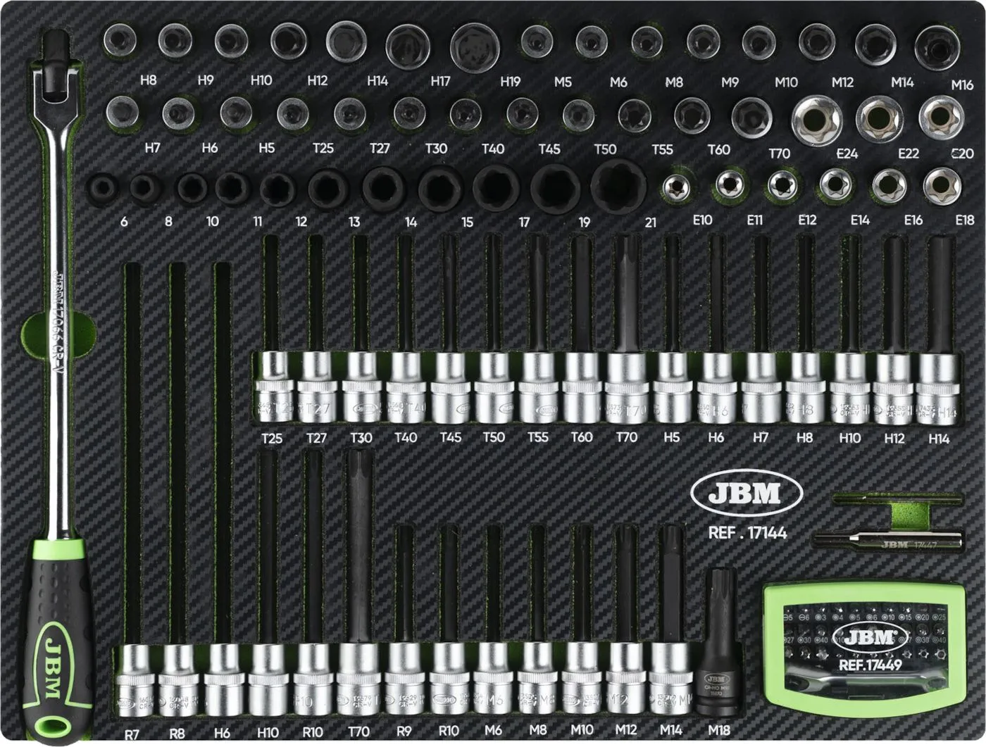 JBM 1/4"+3/8"+1/2" spärr- och hylssats 111 delar, 525mm skum
