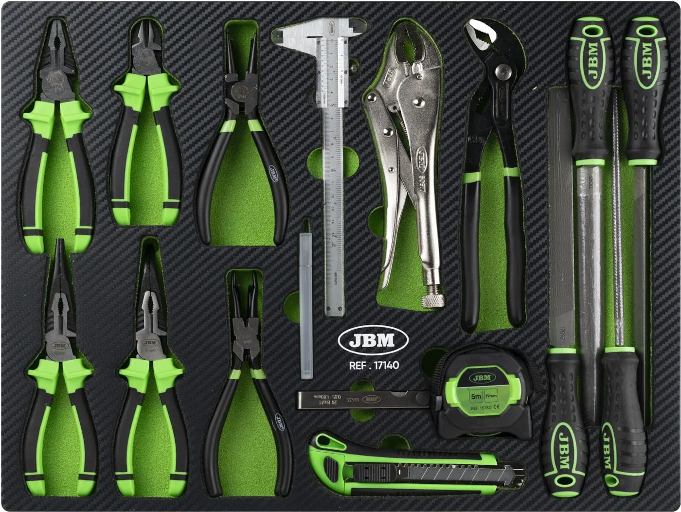 Tångsats inkluderar: segringsringstång för invändigt och utvändigt bruk, spetstång, sidavbitare, kombinationstång, vattenpasstång, låstång, skjutmått, måttband (5m), bladmått, brytkniv, 4 filar. Levereras i 525x395x40mm skuminsats.