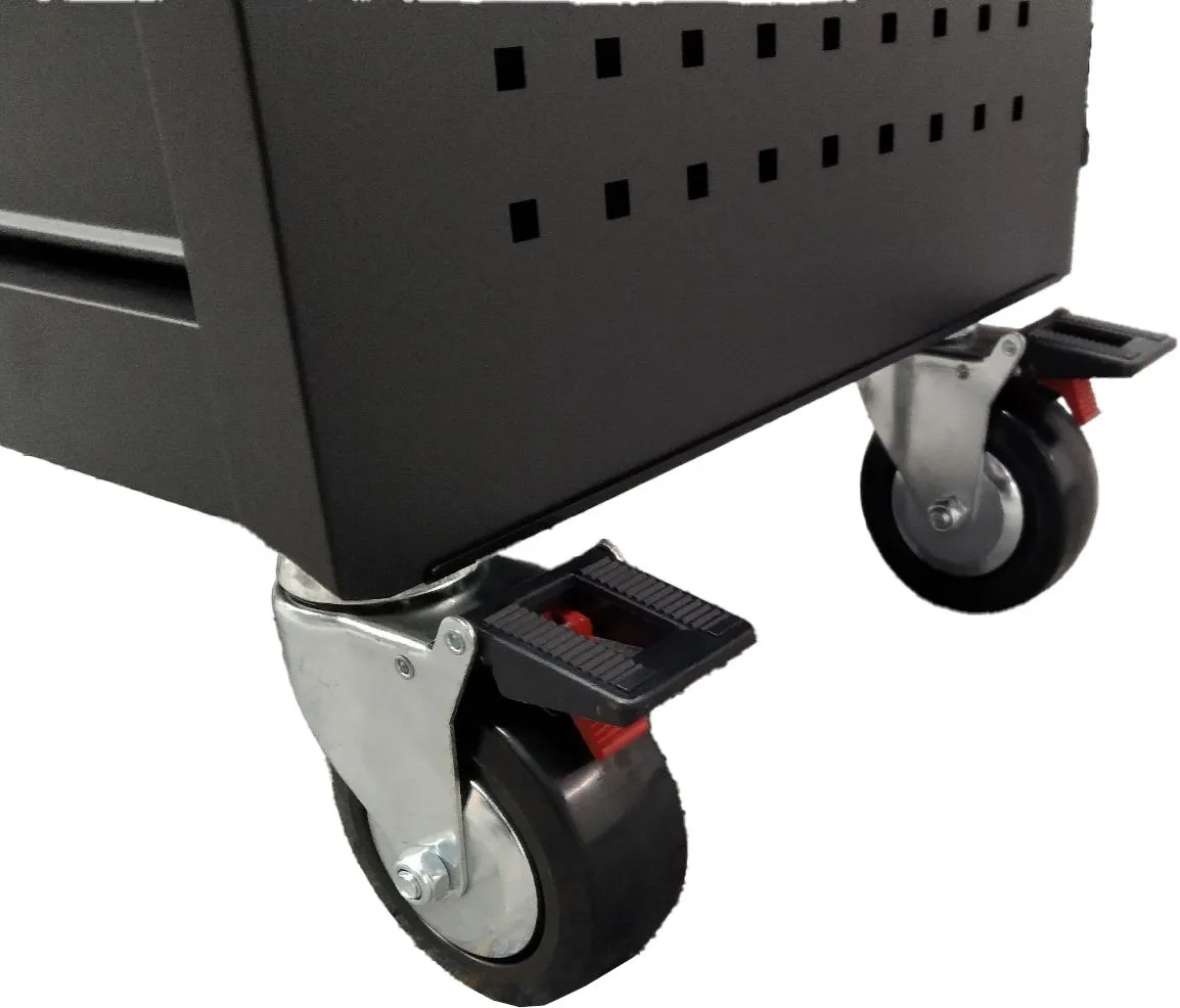 Robust och hållbar konstruktion. Pulverlackering förhindrar repor. Perforerad plåt på båda sidor för montering av tillbehör. Invändigt låssystem för extra säkerhet. Enkel att flytta och låsa: 2 fasta hjul och 2 låsbara svängbara hjul. Vagnens mått: 680x460x1020mm. Vikt: 75 kg.