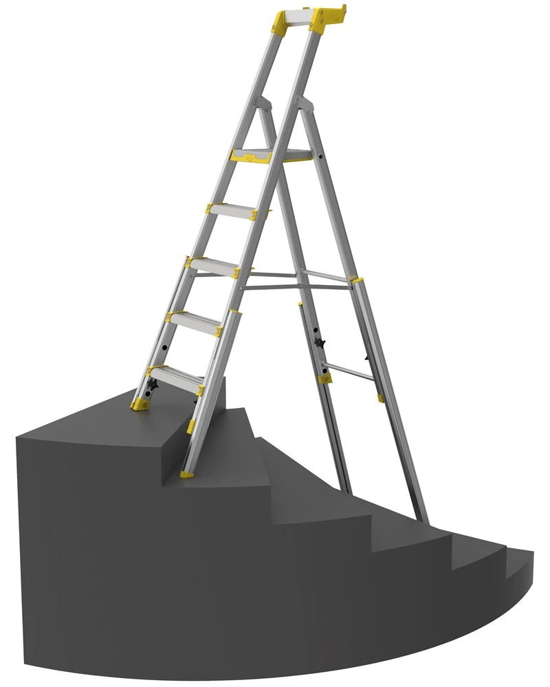Mångsidig trappstege för arbete i trappor eller på ojämna, stabila underlag. Alla fyra ben kan justeras individuellt upp till 415 mm. Bakbenen kan dessutom förlängas upp till 1030 mm, vilket möjliggör stabilt och säkert arbete även under utmanande förhållanden.