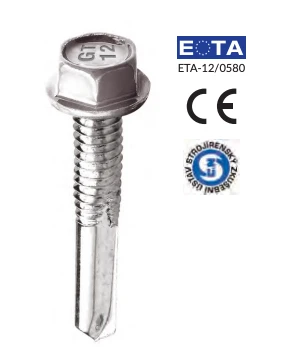 Etanco (ETA, CE) kuusiokanta poraruuvi. Pintakarkaistua terästä. Porakärjen koko nr.5, porautuvuus 12mm. Hienokierre. Lisäkorroosio suoja gRey-pinnoite, väri harmaa. ETA-12/0580, CE. Tarkoitettu profiloitujen teräslevyjen kiinnittämiseen teräsrakenteisiin ja teräslevyjen päällekkäisasennuksiin.