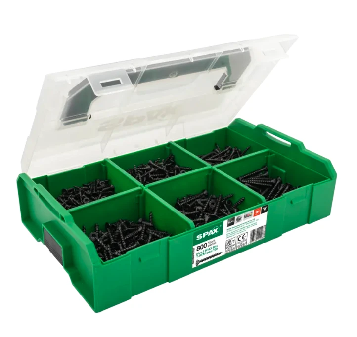 Täydellinen ruuvilaatikko sisältää 800 erikokoista ruuvia ja kolme bit-kärkeä, jotka kaikki on varustettu innovatiivisella uppokantaisella kannalla, T-STAR plus -pinnoitteella ja BLAX-pinnoitteella. Lisäksi modulaarisesti muotoiltavassa sisätilassa on tilaa kolmelle T20-kärjelle T-STAR plus -rakenteella. L-BOXX Mini BLAX voidaan liittää muihin Spax-valikoiman L-BOXX-pakkauksiin napsautusmekanismilla, ja se sopii täydellisesti myös Bosch Sortimo -ajoneuvovarusteisiin. Sinulle tämä tarkoittaa: Ei enää ruuvien etsimistä, sillä kaikki tärkeät mitat ovat aina siististi ja käden ulottuvilla. Sopivan ajoneuvovarusteen avulla kuljetus on täysin turvallista.