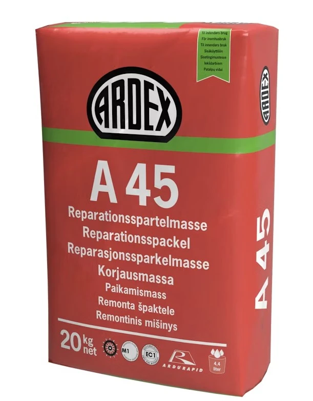 Ardex A45 on sementtipohjainen, nopeasti kuivuva korjausmassa sisätiloihin betonialustojen täyttöihin ja oikaisuihin. Soveltuu porraskulmien, tasojen ja reikien paikkauksiin sekä tasoituksiin. Voidaan käyttää 1,5–20 mm kerroksissa ja päällystää jo tunnin kuluttua levityksestä.