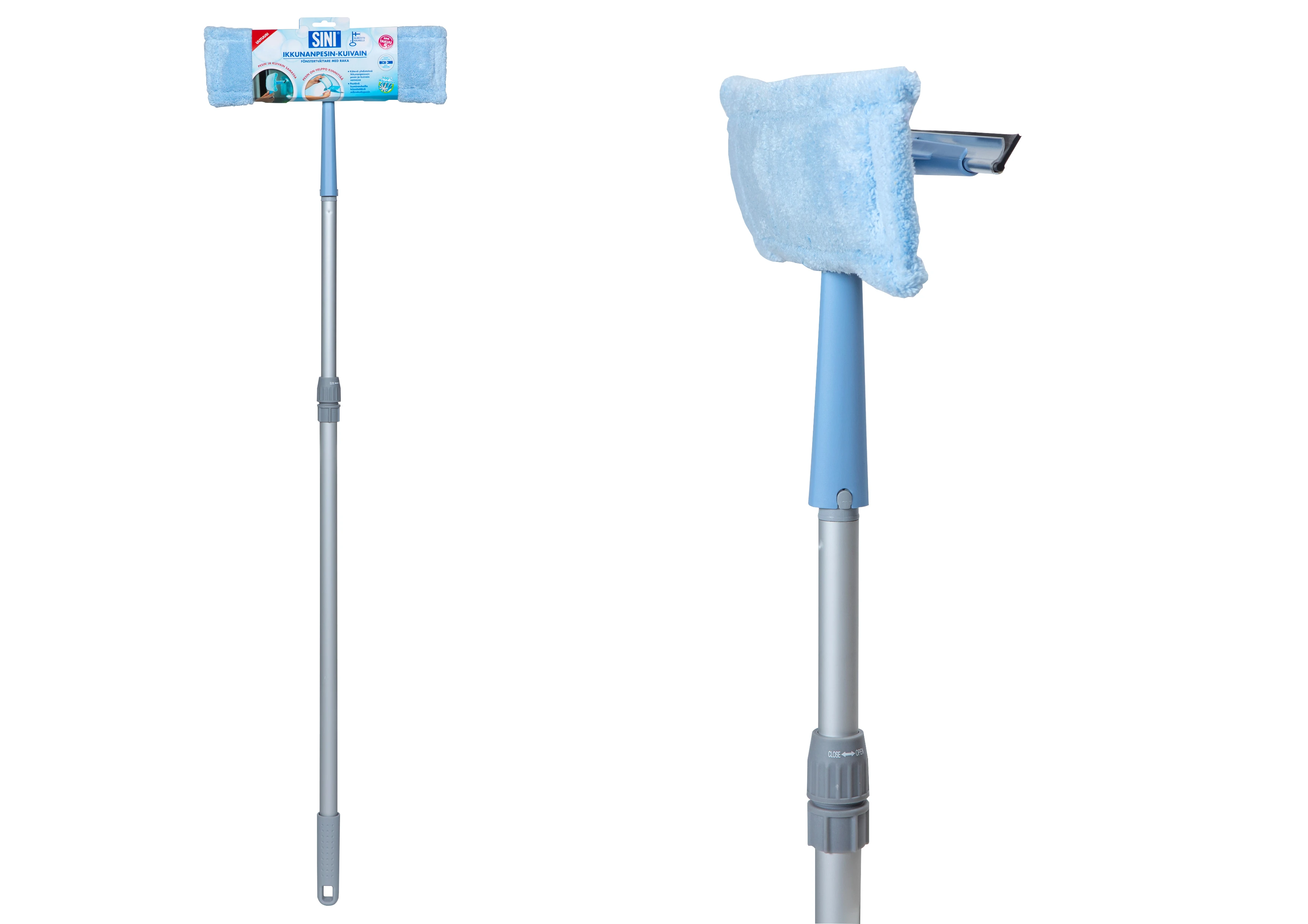 Ikkunanpesin-kuivain on kätevä yhdistelmä, jossa on tehokkaasti puhdistava ikkunanpesin sekä kuivauslasta samassa. Ikkunanpesin-kuivain sopii kaikkien ikkunoiden ja peilien pesuun ja toimii erinomaisesti myös ulkona esim. parvekelasien pesussa. Pesimen leveä mikrokuituinen päällinen kiinnitetään helposti kuminauhoilla, jotka pitävät sen pesun aikana tiukasti paikoillaan. Päällisen voi käytön jälkeen pestä pesukoneessa puhtaaksi. Ikkunanpesin-kuivain sopii SINI-varteen, jolloin ikkunanpesu onnistuu kätevästi korkeammaltakin ilman tikkaita.