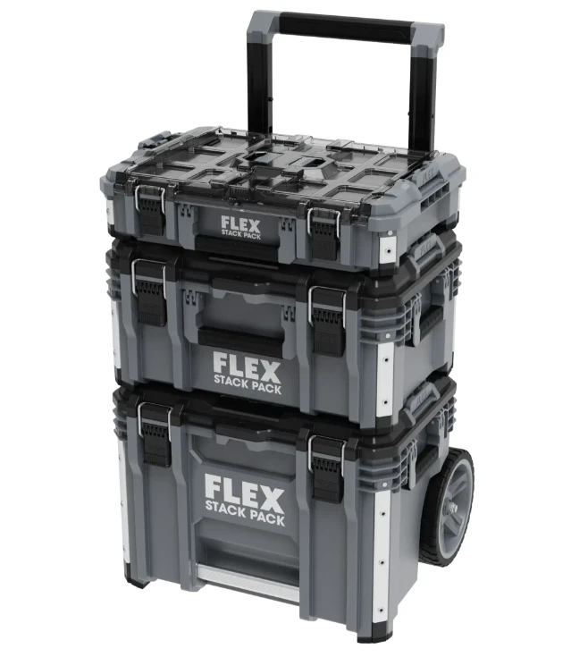STACK PACK -säilytys- ja kuljetusjärjestelmän ansiosta työkalut ja tarvikkeet voidaan helposti kuljettaa työmaalle. Laatikot on valmistettu iskunkestävästä muovista, ja niissä on alumiinivahvisteiset kulmat, jotka suojaavat työkaluja ja tarvikkeita vaativimmilta työmaaolosuhteilta. Laatikoissa on kestävä metallisalpa ja lisäkahvat varmistavat joustavan ja mukavan käsittelyn. Lukittavat pikaliittimet mahdollistavat yksittäisten laatikoiden nopean, joustavan ja vaivattoman liittämisen, jotta säilytysjärjestelmä voidaan koota käyttäjän erityistarpeiden mukaan. Vakiosarja sisältää irrotettavalla teleskooppikahvalla varustetun vaunun, jossa on Ø 23 cm:n kestävät pyörät, suuren kantolaatikon ja keskikokoisen laatikon kaasujousilla sekä Big Organizer säilytyslaatikon läpinäkyvällä kannella.